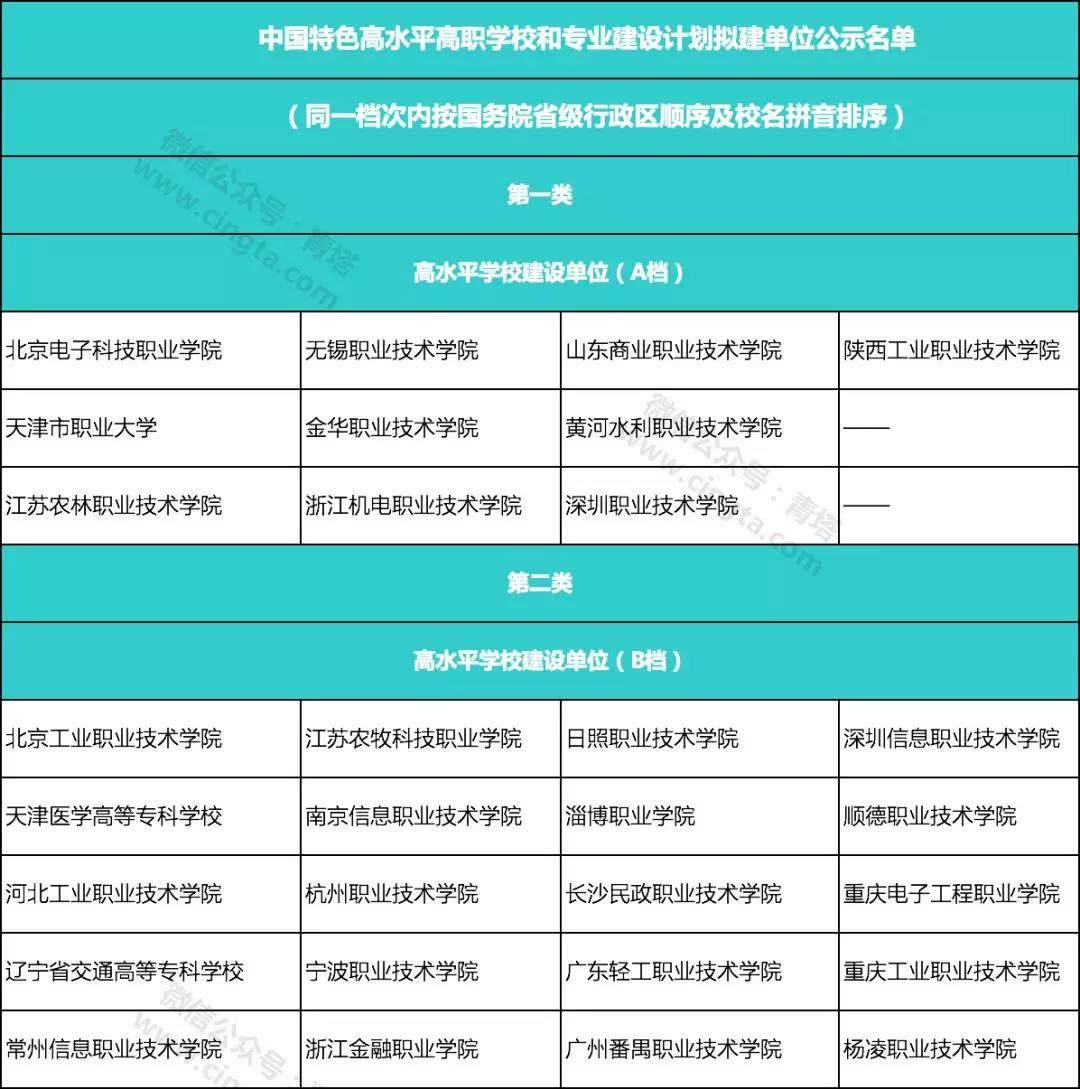 中國特色高水平高職學校和專業建設計劃擬建單位公示名單: